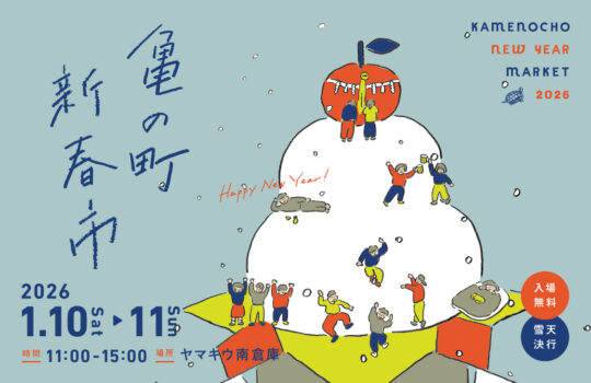 亀の町新春市は、ヤマキウ南倉庫の毎年恒例イベント。新しい年の始まりを祝い、おなじみの顔ぶれと新しい出会いが交差する、あたたかな「市」です。